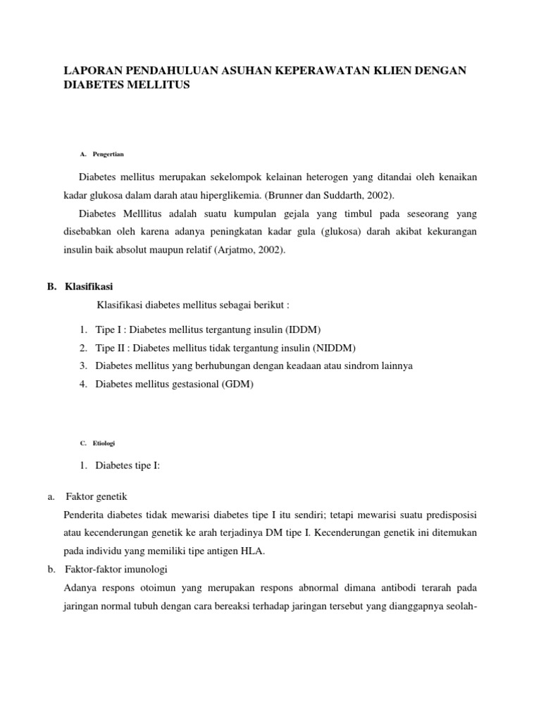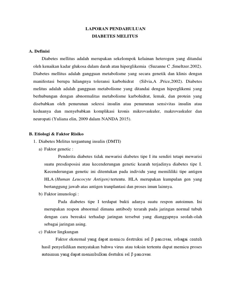 Laporan Pendahuluan Diabetes Melitus from imgv2-1-f.scribdassets.com Diabetes mellitus tipe ii merupakan tipe diabetes yang lebih umum, lebih banyak penderitanya dibandingkan diabetes mellitus tipe i. Salah satu provinsi yang memiliki prevalensi diabetes yang tinggi adalah provinsi banten. Diabetes melitus dikenal sebagai silent killer karena sering tidak disadari oleh penderitanya dan saat sudah disadari sudah terjadi komplikasi (kemenkes ri, 2014). Jurnal laporan pendahuluan diabetes melitus berikut ini adalah jurnal laporan pendahuluan diabetes melitus yang bisa anda unduh secara gratis dengan menekan tombol download yang ada pada tautan dibawah ini. Menimbulkan gejala diabetes melitus jika disertai dengan kekurangan protein. Diabetes melitus merupakan salah satu penyakit degeneratif, yang akan meningkat jumlahnya di masa datang. Pendekatan terbaru untuk cangkok adalah segmental dari donor hidup saudara kembar identik. Jumlah itu akan membengkak menjadi 300 juta orang (suyono, 2006).